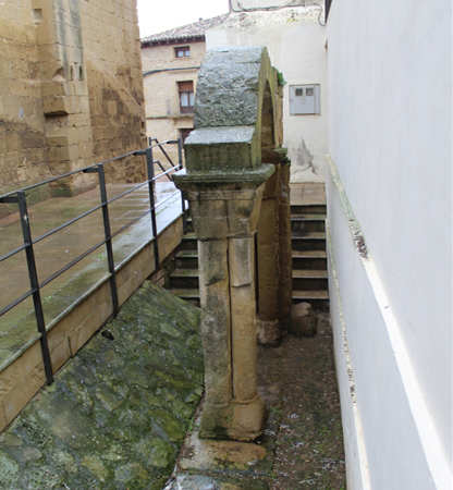 De este primer edificio no quedan restos visibles a excepción de un arco de medio punto y el arranque de otro que podrían haber formado parte del claustro. Ambos apean sobre columnas de fuste liso y capiteles con decoración de líneas incisas. Están situados en el lado norte y puestos en valor con un criterio muy acertado de cierre por dos lados con balaustrada y acceso por el tercero a través de una escalera.