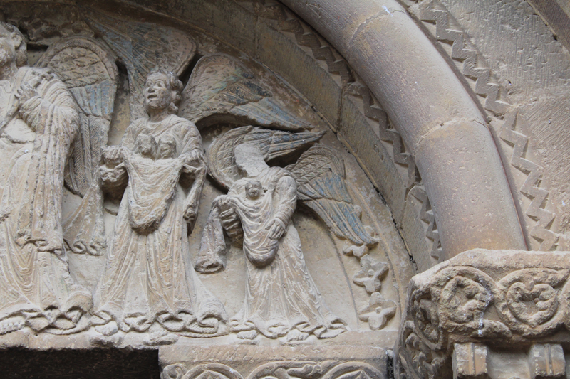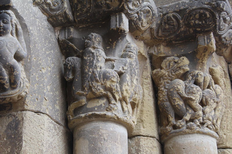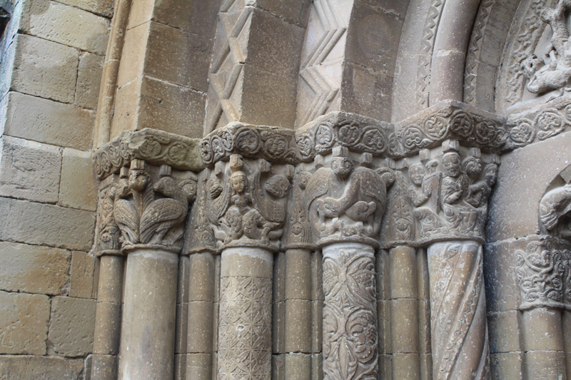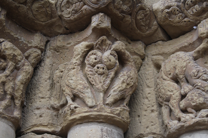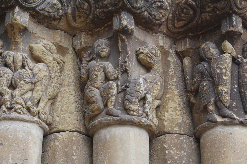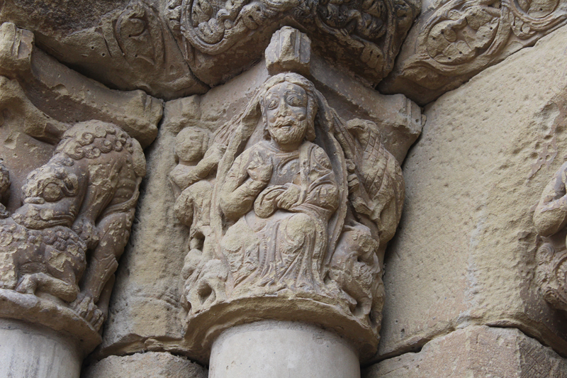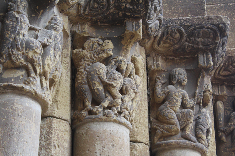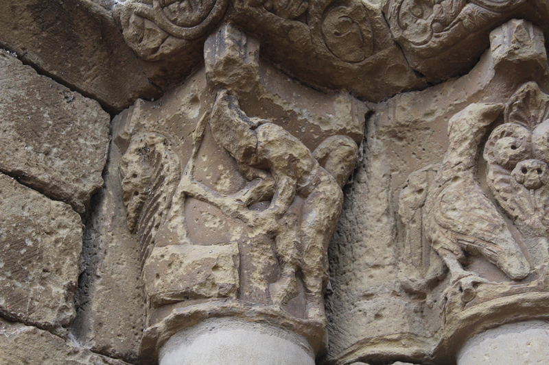 Hay en esta portada algunas piezas singulares como la que adorna el primer capitel del lado izquierdo. Reproduce a un maestro cantero picando piedra, excepcional por las pocas veces que se puede ver este tema en las iglesias románicas.