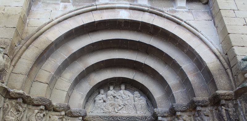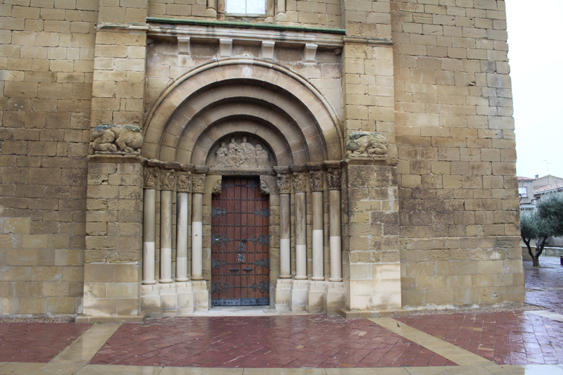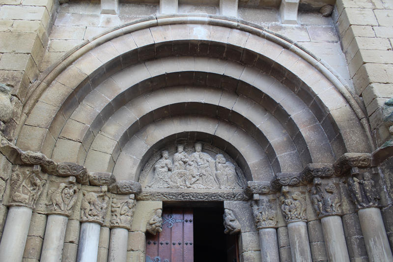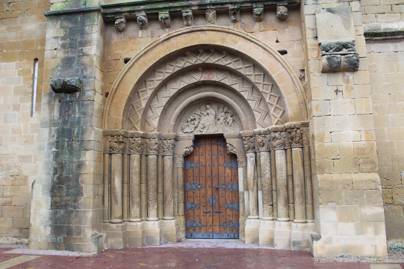 Se compone de cuatro arquivoltas de arista viva, excepto la interior que se decora con baquetón y fina filigrana de zig-zag a cada lado del mismo. Las dos intermedias se adornan con gran zig-zag triple la interna y con rombos la externa. Por fuera de las cuatro hay una moldura de doble baquetón fino. El intradós de la archivolta del triple zig-zag está decorado con escudos heráldicos pintados, uno en cada dovela. En el frontal de la clave -que no tiene zig-zag- hay una cruz patada en pigmento rojo; probablemente de consagración.