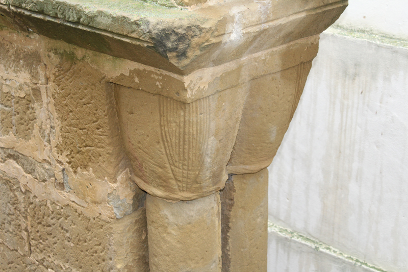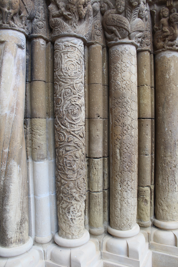 Tanto las arquivoltas como las columnas poseen mayor riqueza ornamental. Motivos geométricos y zig-zag en las primeras recuerdan al románico normando. Las columnas aparecen con tallas vegetales y geométricas que evocan formas decorativas musulmanas.