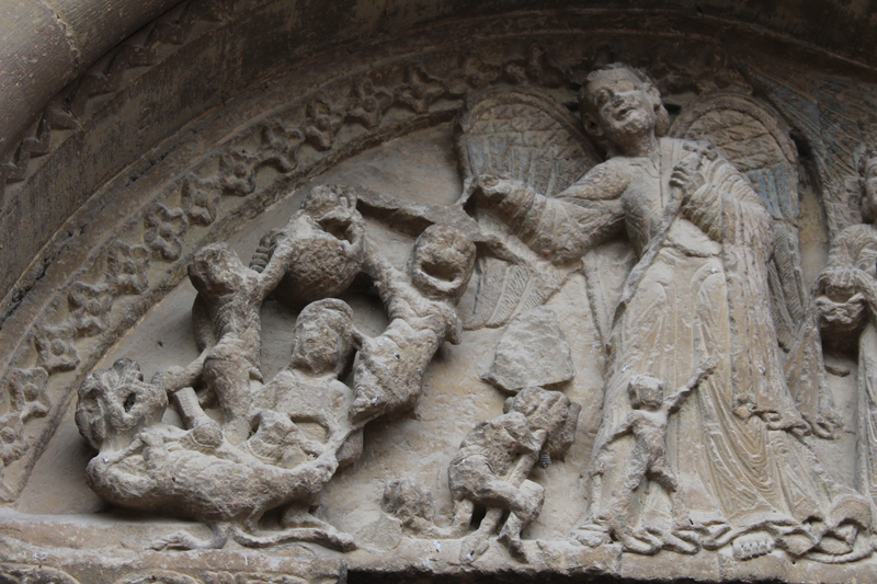 El tímpano muestra al arcángel San Miguel en sus dos formas iconografías más habituales, el pesaje de las almas previo al Juicio Final o «psicostasis» y la lucha con el demonio.