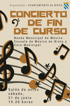Concierto fin de curso banda municipal de música junio 19, 2025Llega el final del curso y el concierto de la Banda Municipal de Música de Biota. También actuarán los alumnos más jóvenes de la Escuela de Música y el Coro de Mayores. El sábado, 21 de junio a las 19.30 horas en el Salón de Actos. Os esperamos.