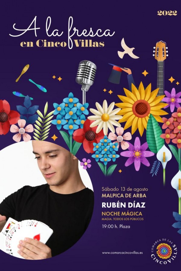 NOCHE MÁGICA EN MALPICA DE ARBA agosto 9, 2022Este sábado, 13 de agosto, actuará en la plaza de Malpica de Arba el mago RUBÉN DÍAZ, será a las 19.00 horas para todos los públicos. Esta actuación se enmarca dentro del programa cultural de verano «A LA FRESCA» de Comarca de Cinco Villas.