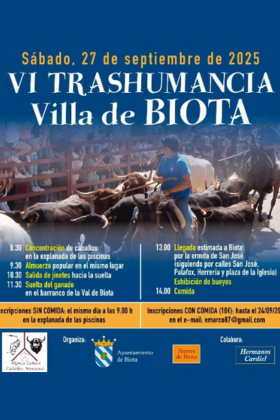 Se va a celebrar la VI Trashumancia Villa de Biota, el sábado 27 de septiembre de 2025. Esta es la programación prevista: 08:30 Concentración de …