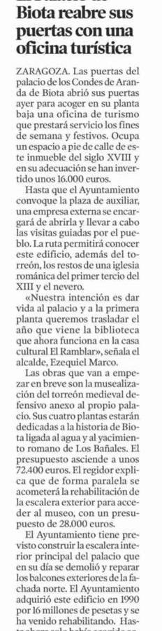 OFICINA DE TURISMO marzo 22, 2021Nueva Oficina de turismo en el Palacio del Vizconde de Biota. Abrirá el sábado, 20 de marzo, en horario de mañana, de 10.00 a 14.00 y de tarde, de 16.00 a 19.00. Próximamente se anunciará el horario de Semana Santa.