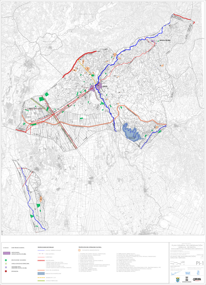 Plan General de Ordenación Urbanística APROBACIÓN DEFINITIVA DEL PLAN GENERAL DE ORDENACIÓN URBANA DE BIOTA Sistema de información urbanística de Aragón Descarga PGOU completo MEMORIAS Memoria descriptiva Memoria justificativa NORMAS URBANÍSTICAS Normas urbanísticas CATÁLOGO Catálogo Fichas Catálogo completas Anexo II - Estudio arqueológico Anexo III - Estudio arqueológico PLANOS Índice planos información Índice planos ordenación ESTUDIO ECONÓMICO Estudio económico 2021 ESTUDIO AMBIENTAL Memoria: Memoria Anejos: ANEJO 01 Legislacion ANEJO 02 Tramitación ANEJO 03 Estudio Hidrológico ANEJO 04 Proyecto Delimitación carretera Planos: Topografía Figuras protección A Flora Fauna Hábitats Geológico Geomorfología Deslizamientos Edafología Permeabilidad Erosión Condiciones constructivas Vulnerabilidad Inundabilidad Incendios Unidades de paisaje Mapa de riesgos Explotación ganadera I Explotación ganadera II Vinculación con Ejea Clasificación del término PLANOS INFORMACIÓN PI_1_ESTRUCTURA_TERRITORIAL PI_2_1_USOS-SUELO_TERMINO PI_2_2_USOS-SUELO_NUCLEO PI_3_1_PLANEAMIENTO_ANTERIOR_TM PI_3_2_PLANEAMIENTO_ANTERIOR_NUCLEO PI_4_1_ABASTECIMIENTO PI_4_2_SANEAMIENTO PI_4_3_ALUMBRADO_RESIDUOS PI_4_4_PAVIMENTOS PI_5_1_CATASTRO_RUSTICA PI_5_2_CATASTRO_URBANA PI_6_ALTURAS_EDIFIC PI_7_ESTADO_EDIFIC PI_8_MAPA_RIESGOS PLANOS ORDENACIÓN PO-1_ESTRUCTURA_ORGÁNICA PO-2.1_CLASIFICACIÓN_TM_V1 PO-2.2_CLASIFICACIÓN_NÚCLEO_URBANO_V9 PO-3_ORDENACIÓN_NÚCLEO_URBANO_V5 PO-4_1_CATALOGO_TM PO-4_2_CATALOGO_NUCLEO Sistema de información urbanística de Aragón Descarga PGOU completo Los documentos que están en formato .PDF necesitan tener instalado en el ordenador Acrobat Reader para visualizarlos o imprimirlos.Pinche en la imagen para descargar e instalar la última versión.
