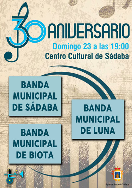 La banda municipal de Sádaba cumple 30 años y con motivo de este aniversario tendrá lugar una actuación a la que están invitadas la banda municipal de Biota y la banda municipal de Luna.